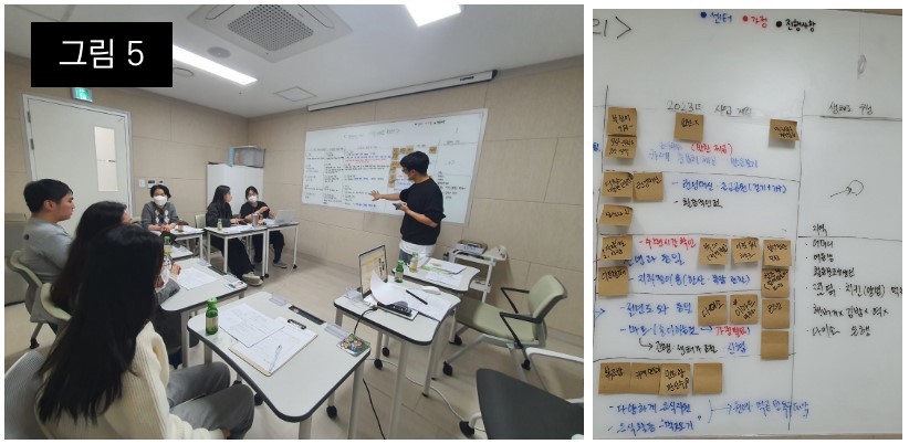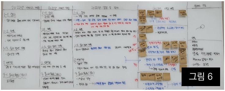 센터장이 회의를 진행하면서, 나온 이야기를 키워드로 해서 포스트잇을 활용해서 내년 계획을 정리 [그림 5 참조]