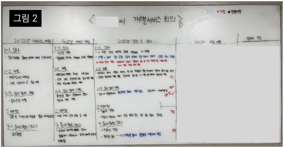 센터 내 사회사업가가 모여서 ‘개별서비스지원 모니터링’ 자료를 확인하고 보완함. 특히 회의 참여자가 쉽게 확인하실 수 있도록 변화 정도를 양적인 수치화 및 질적인 걸로 정리 [그림 1 참조]